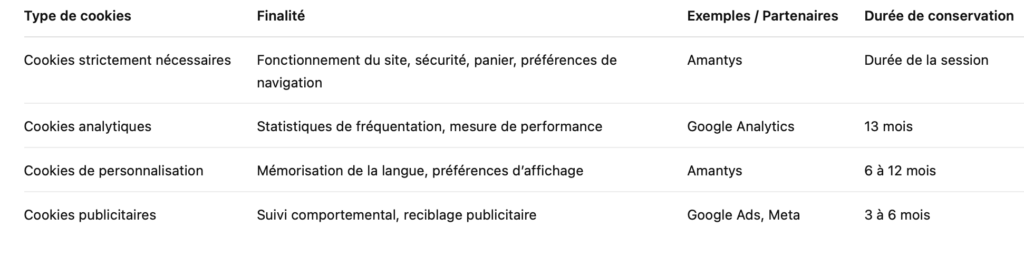 Le site www.amantys.fr utilise des cookies et technologies similaires afin d’améliorer votre expérience, personnaliser le contenu et analyser les statistiques de navigation.